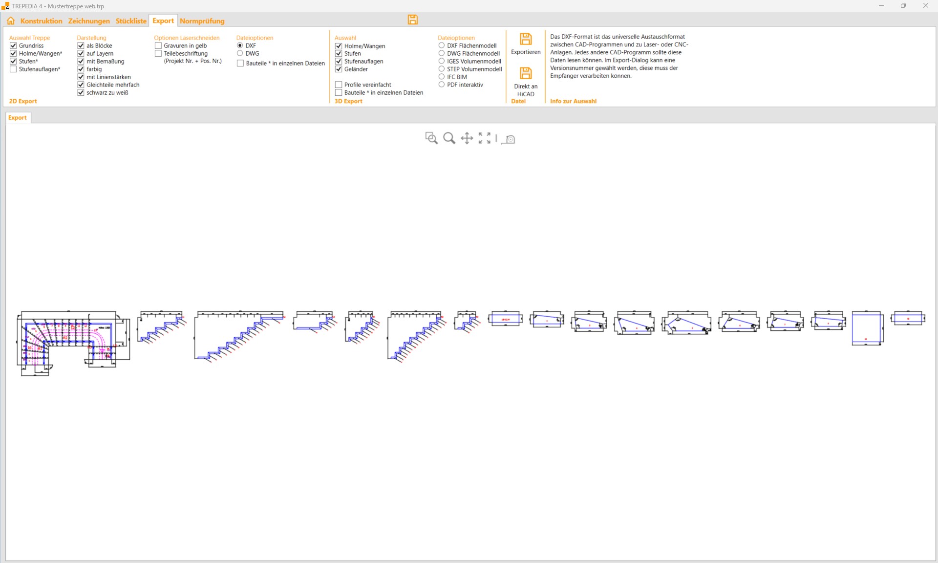 Le format « classique » est l'exportation au format DXF. Ce format d'échange peut être lu par presque tous les logiciels CAO et par tous les logiciels de machines-outils. TREPEDIA permet également de choisir le numéro de version sous-jacente.