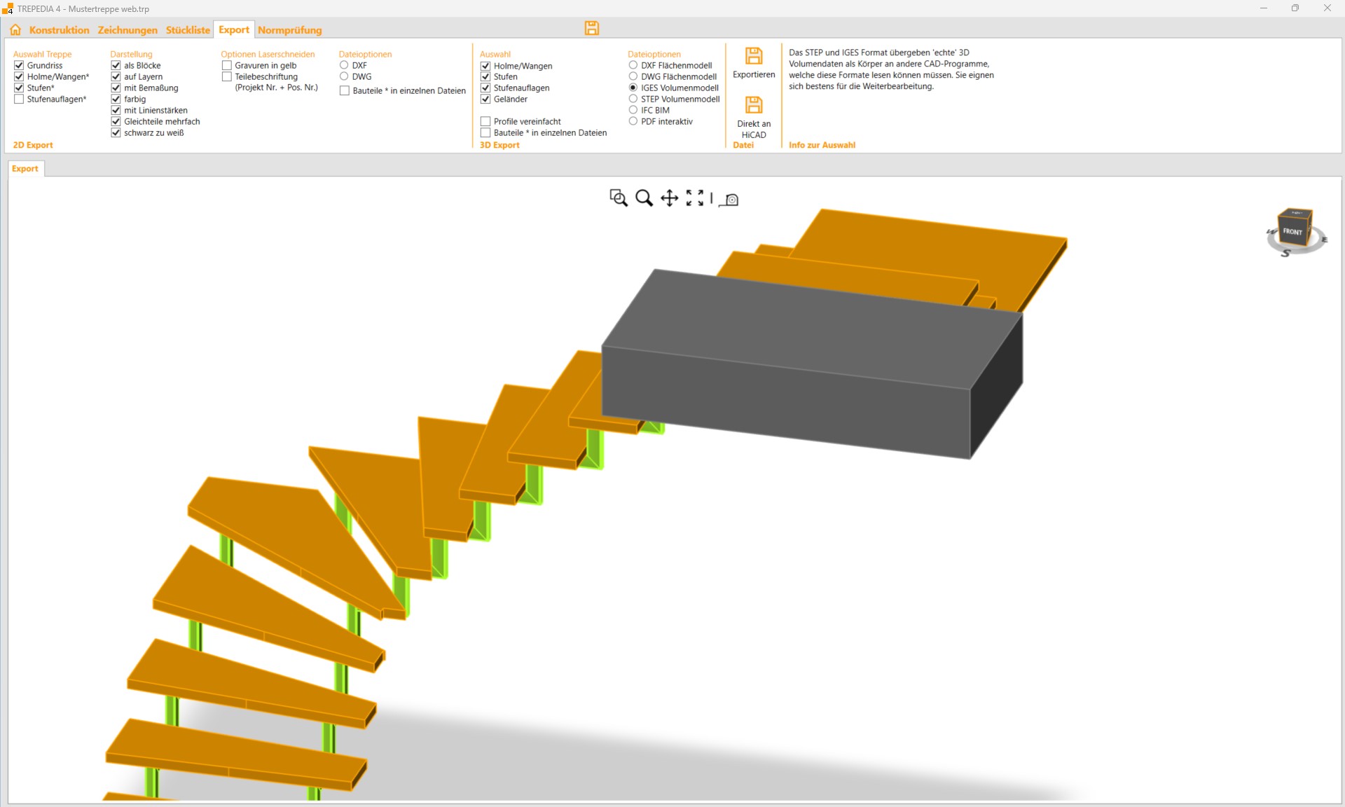 Le format 3D DXF et DWG transmet le modèle 3D de l'escalier sous forme de lignes et de surfaces. Ces dernières années, de plus en plus d'entreprises utilisent des logiciels 3D qui traitent les données sous forme de volumes. Elles apprécieront particulièrement la possibilité d'exporter au format IGES ou STEP, car ces formats transmettent des données de volumes réels, idéales pour un traitement ultérieur ou une intégration dans d'autres projets.